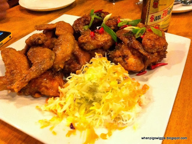 Teri-Q Gold = Crispy chicken wings coated with soybean sauce and garlic flavoring inside.
